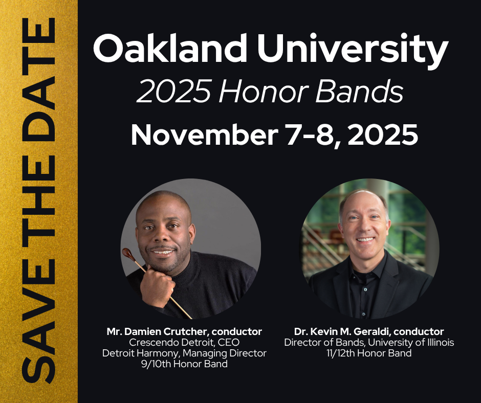The 2025 Oakland University Honor Band brings together talented high school musicians from across the state for a meaningful weekend of artistry and collaboration. This year’s event will feature two ensembles: a 9th–10th Grade Honor Band conducted by Mr. Damien Crutcher and an 11th–12th Grade Honor Band conducted by Dr. Kevin Geraldi.